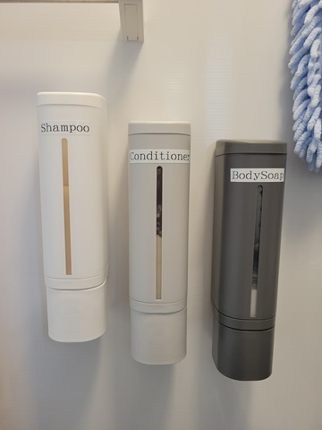 シャンプーやボディーソープなどが下から出るマグネットディスペンサー。