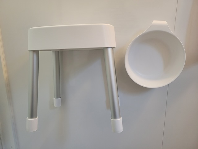 イスや洗面器も壁に付けられるので、床との接触部分が汚れにくい。